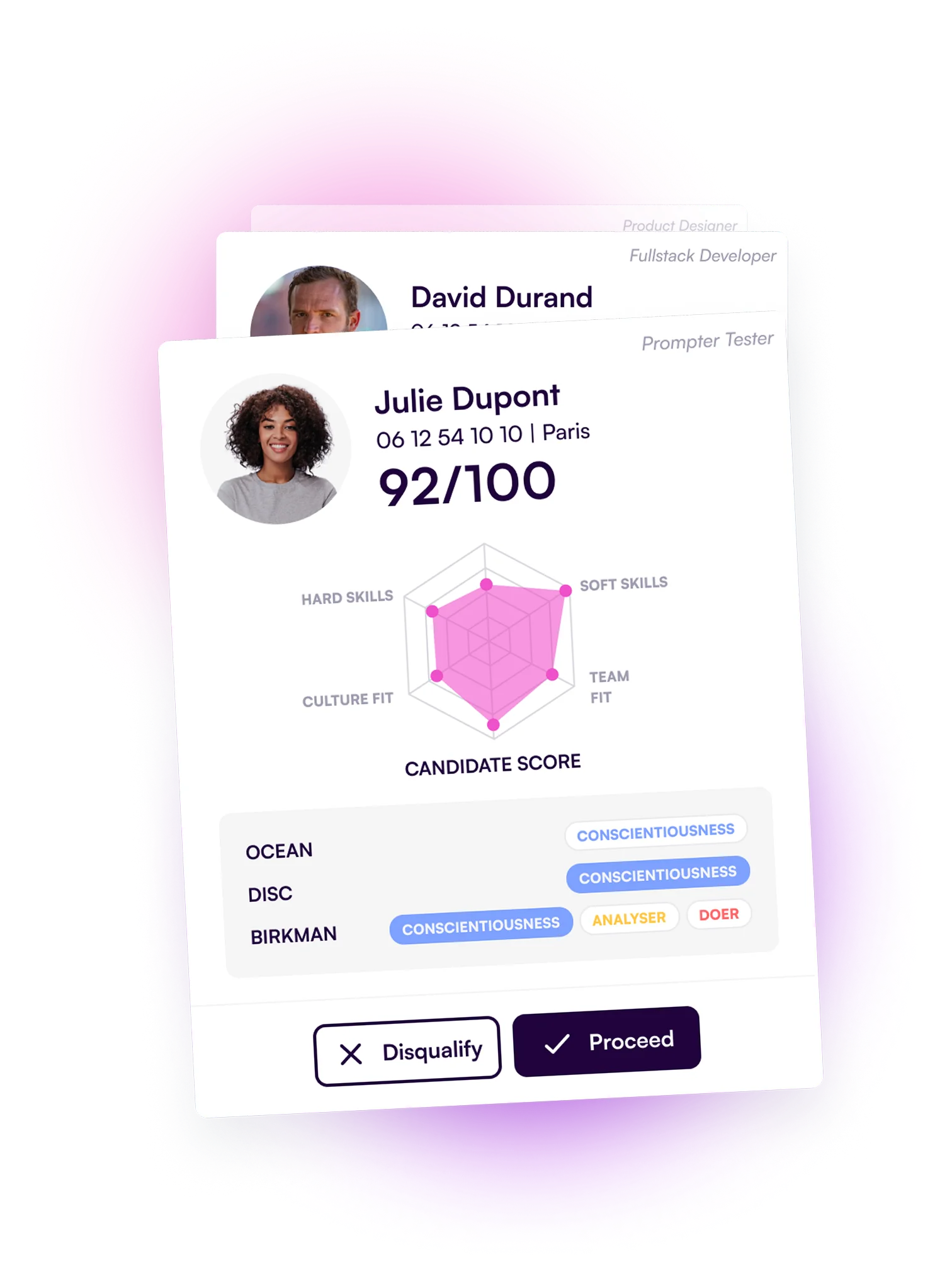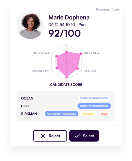 A significant challenge was finding the right UX writing for the action buttons. Words like « Validate » or « Proceed » were too strong, implying a final hiring decision. We ultimately chose: