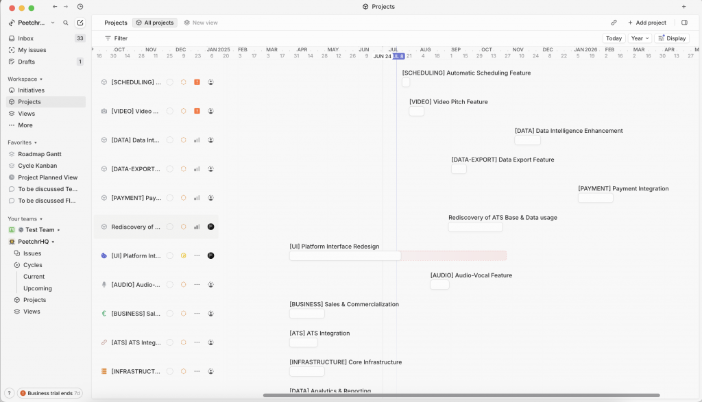 Upon my arrival, there was no formal roadmap beyond a weekly task list. My first action was to introduce structure and visibility by creating a comprehensive product roadmap in Linear integrating epics and features in a 6 months roadmap, a quarter after the commercial release in June.