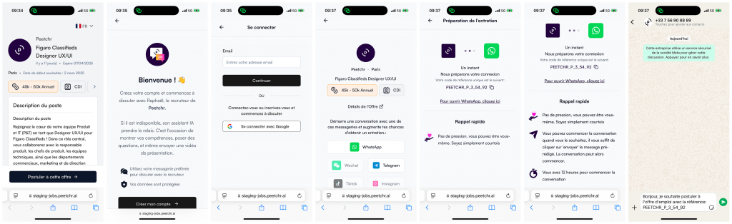 The initial user journey was complex. It required a recruiter to manually place a Peetchr link in their company’s ATS. A candidate would click this link from a job board, land on a Peetchr-hosted page, create an account, and then be redirected to WhatsApp to begin a lengthy, question-based conversation with the AI. This multi-step, multi-platform process was the first sign of underlying friction.